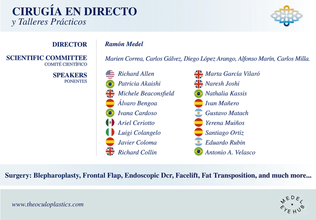 Intentaremos reunir a los mejores cirujanos oculoplásticos mundiales para que participen en estas sesiones y, aprovechando su presencia, puedan realizar cirugías en directo mientras comparten y explican sus técnicas. Intentaremos ofrecer el mayor número posible de intervenciones, que se retransmitirán en directo desde las instalaciones de HOSPITAL QUIRÓN MÁLAGA, donde dispondremos de más de 6 horas de procedimientos a doble quirófano. Entre ellos se incluirán distintas técnicas de ptosis, blefaroplastia, dacriocistorrinostomía, cirugía de la ceja y lifting mediofacial, entre otras intervenciones. Asimismo, el viernes por la tarde celebraremos un taller dedicado al rejuvenecimiento facial, donde abordaremos diferentes técnicas con láser, IPL y bioestimuladores, entre otros tratamientos.